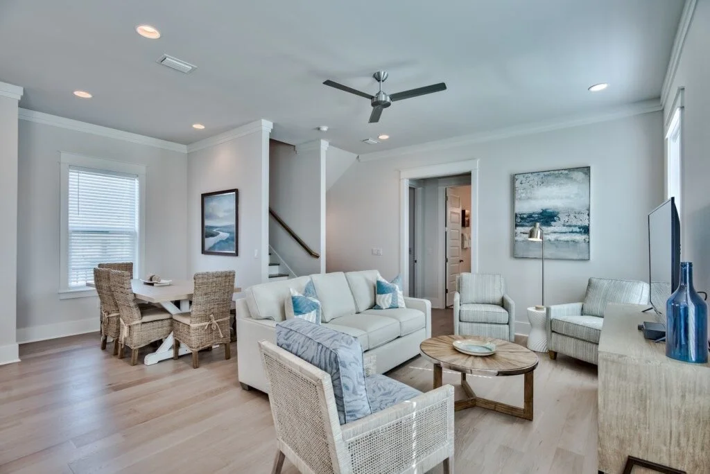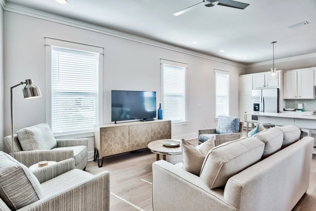The living area includes comfortable seating, lots of natural light, and smart HDTVs throughout the home with access to streaming services.